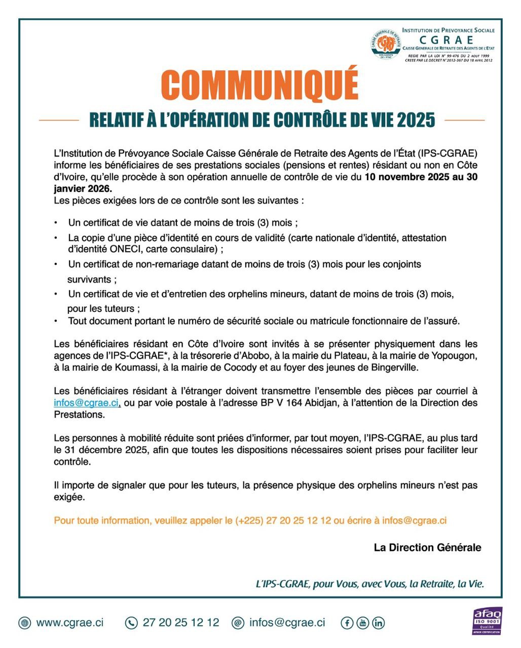 Abidjan, le 10 novembre 2025 – L'Institution de Prévoyance Sociale Caisse Générale de Retraite des Agents de l'État (IPS-CGRAE) annonce le début de son opération annuelle de contrôle de vie 2025. Cette opération, destinée aux bénéficiaires des prestations sociales, notamment les pensions et rentes, se déroulera du 10 novembre 2025 au 30 janvier 2026.